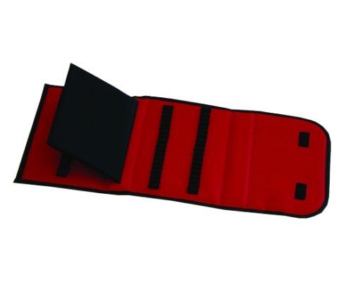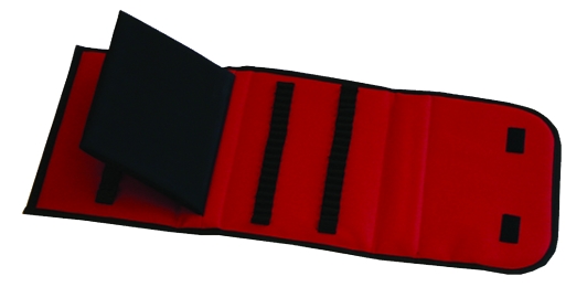 Dvoudílné ampulárium z balonové látky. Na jedné straně je místo pro 13 hrubších zkumavek, na druhé straně j...