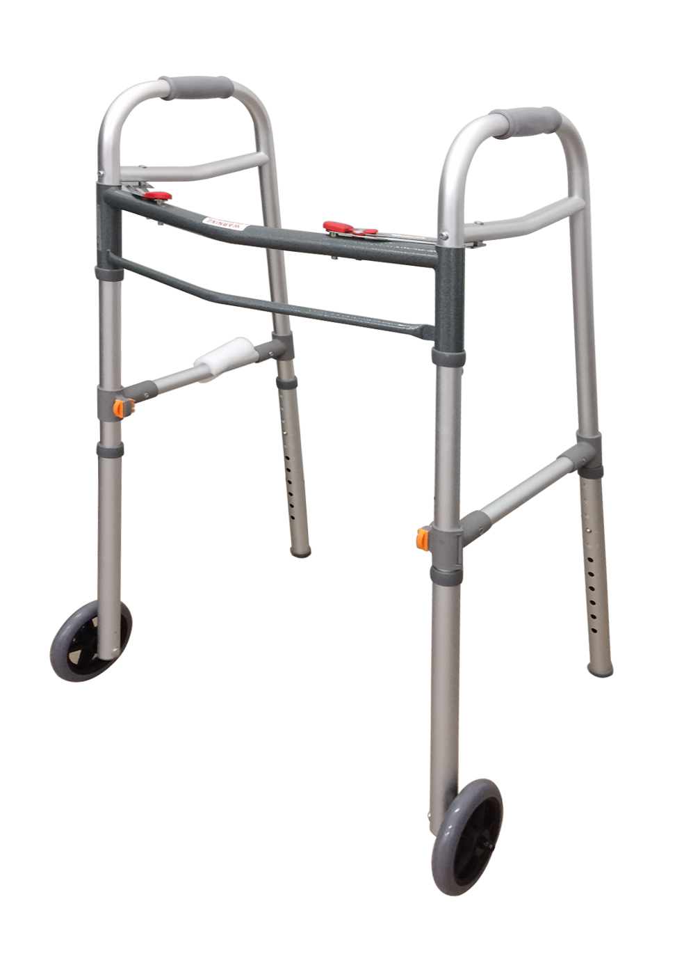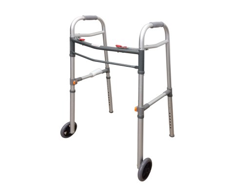Skladatelné chodítko z hliníkovým rámem ukončeným pryžovou zátkou. Pogumované madla, nastavitelná výška v i...