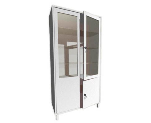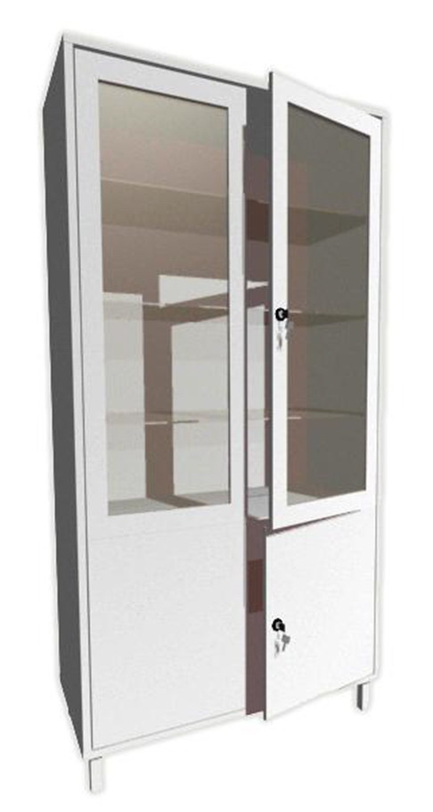 Kovová skříň vybavena bezpečnostním zámkem. 2 ks horních dvířek jsou prosklené, dvě dolní dvířka mají výplň...