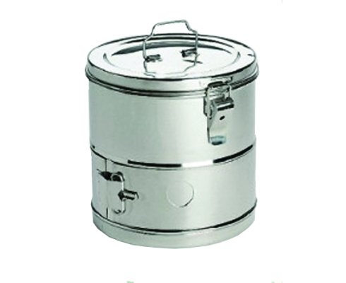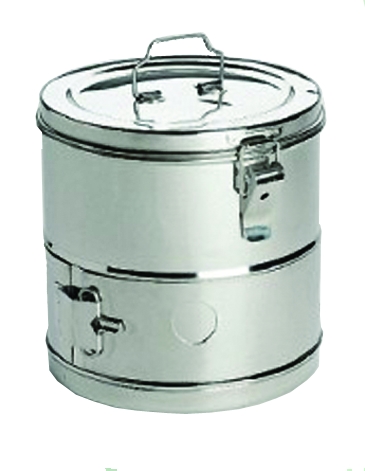 Vyrobena z nerezové oceli. Bubnovitý tvar. Posuvná dvířka na boku. Držák na vrchu. (průměr x výška)