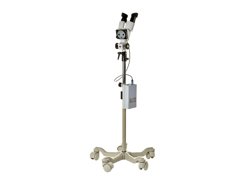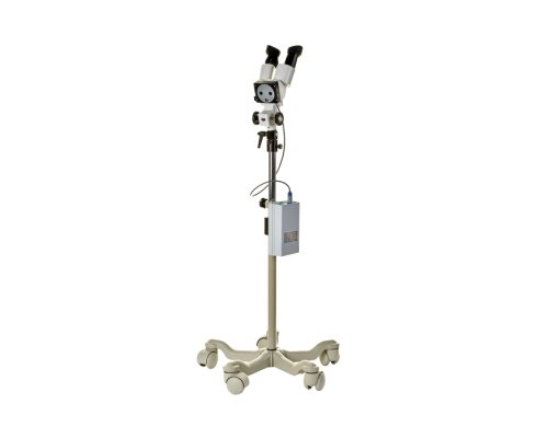 Binokuláry kolposkop s halogenovým osvětlením umístěn na mobilním stojanu s nastavitelnou výškou (73-104 cm...