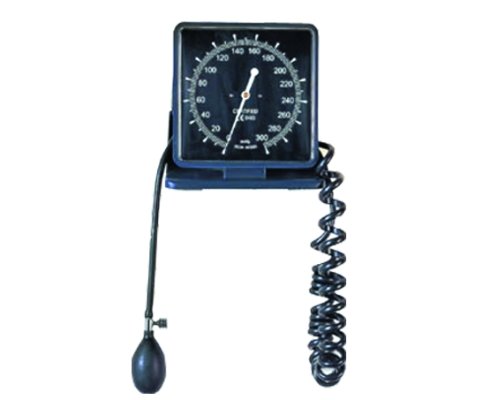 Hranatý manometr, dobře čitelný, průměr stupnice 14 cm s rozsahem do 300 Hgmm.