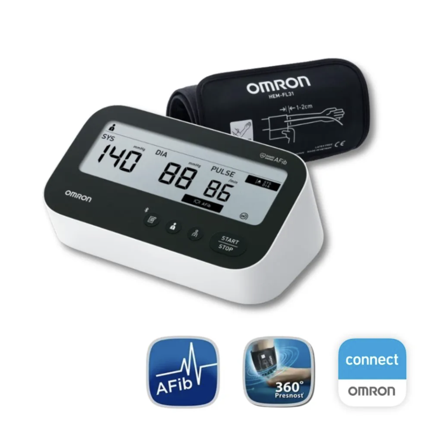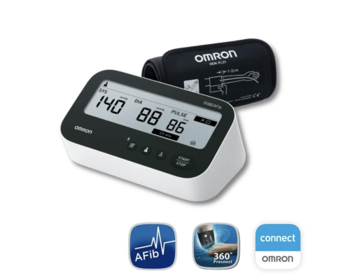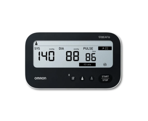 - funkce Intellisense AFib – detekce fibrilace síní už z jednoho měření. Jedinečný algoritmus poháněný AI nyní rozpoznává i náznaky AFib. Přesnost nové technologie OMRON byla testována s 12svodovým EKG. Tlakoměry OMRON s technologií IntelliSense AFib měly citlivost 95,1 %, specificitu 98,6 % a přesnost 97 %. To je ve srovnání se zařízeními jiných značek příznivější.