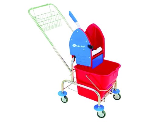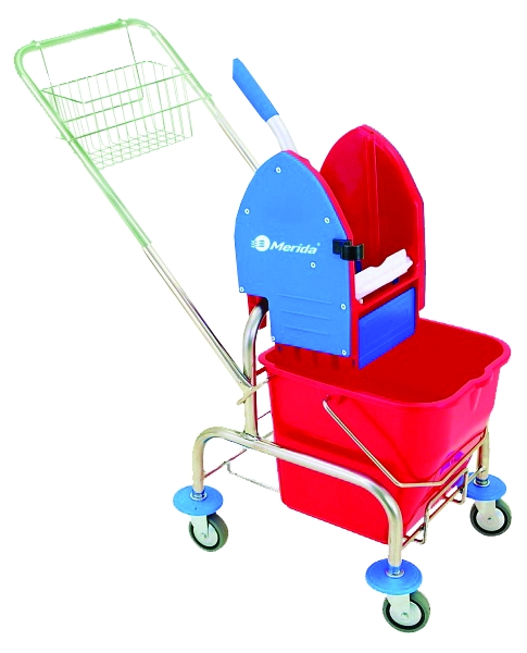 Pochromovaný kovový rám na kolečkách s kovovým košíkem na čistící potřeby. 17 litrové vědro z umělé hmoty. ...