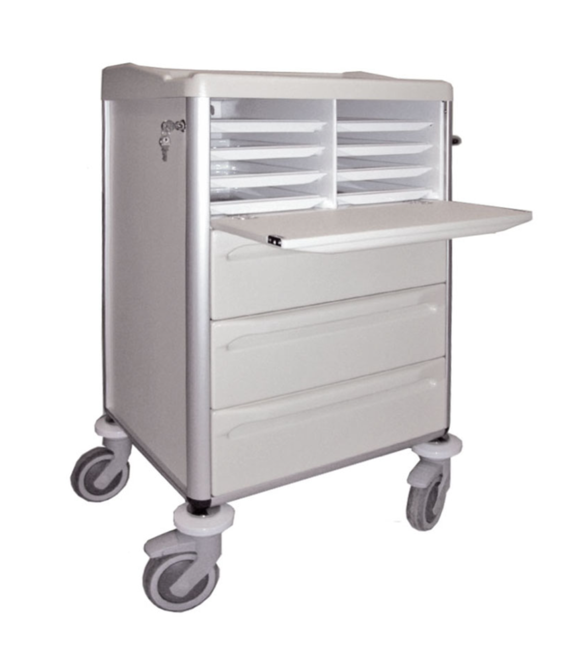 Vozík je jedněmi dveřmi a třemi zásuvkami. Vozík je použitelný všude tam, kde jsou denní dávky léků rozdělo...